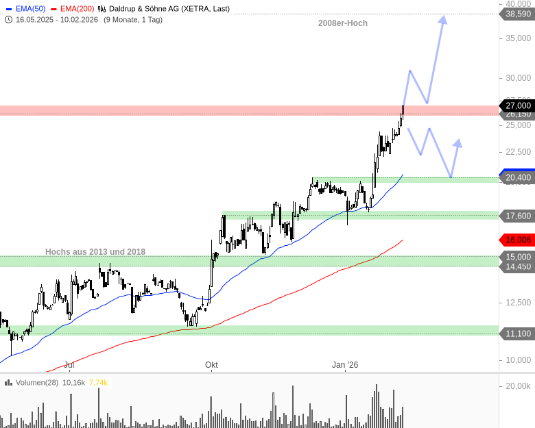 Die kurzfristige Marschrichtung ist unklar. Prinzipiell könnte es im Bereich der Hürde bei 26,15 – 27,00 EUR zu Konsolidierungen kommen. Allerdings beschleunigt sich die Aufwärtswelle aktuell unter hohen Handelsumsätzen, weshalb auch ein direkter Durchbruch nach oben hin denkbar wäre.
