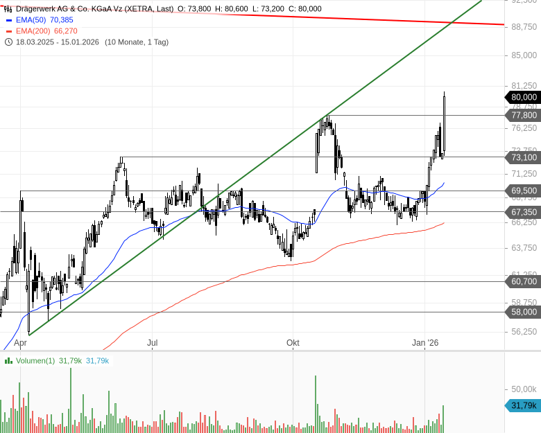 - Drägerwerk AG & Co. KGaA Vz – WKN: 555063 – ISIN: DE0005550636 – Kurs: 80,000 € (XETRA)