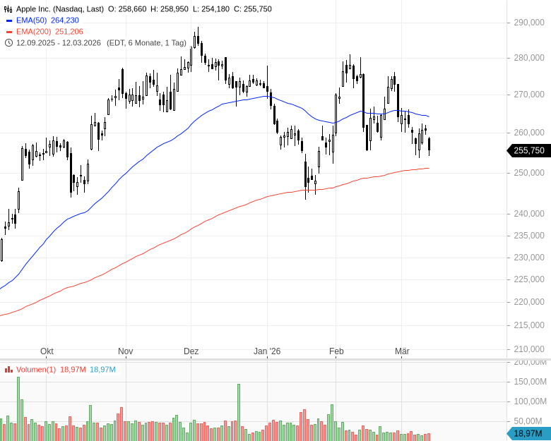 • Apple Inc. – WKN: 865985 – ISIN: US0378331005 – Kurs: 255,750 $ (Nasdaq)