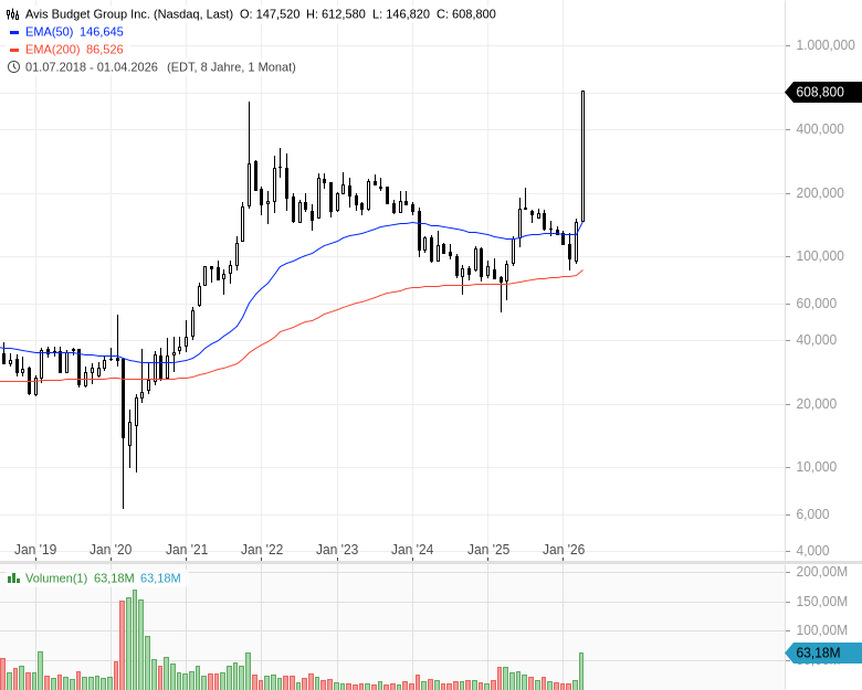 Dass der Kursanstieg mit der operativen Performance von Avis Budget aktuell nichts gemein hat, zeigen die blanken Zahlen. Analysten erwarten 2026 einen minimalen Umsatzanstieg und eine leichte Verbesserung beim Ergebnis. Für den Autovermieter muss man aktuell aber das 136-fache des erwarteten Gewinns hinblättern. Zudem ist das Unternehmen mit dem mehr als siebenfachen EBITDA verschuldet und wird nach aktuellen Prognosen vor 2028 keinen positiven Free Cashflow erzielen. Die neuen Aktien, die bald auf den Markt kommen werden, sind bei dieser Betrachtung noch gar nicht berücksichtigt.