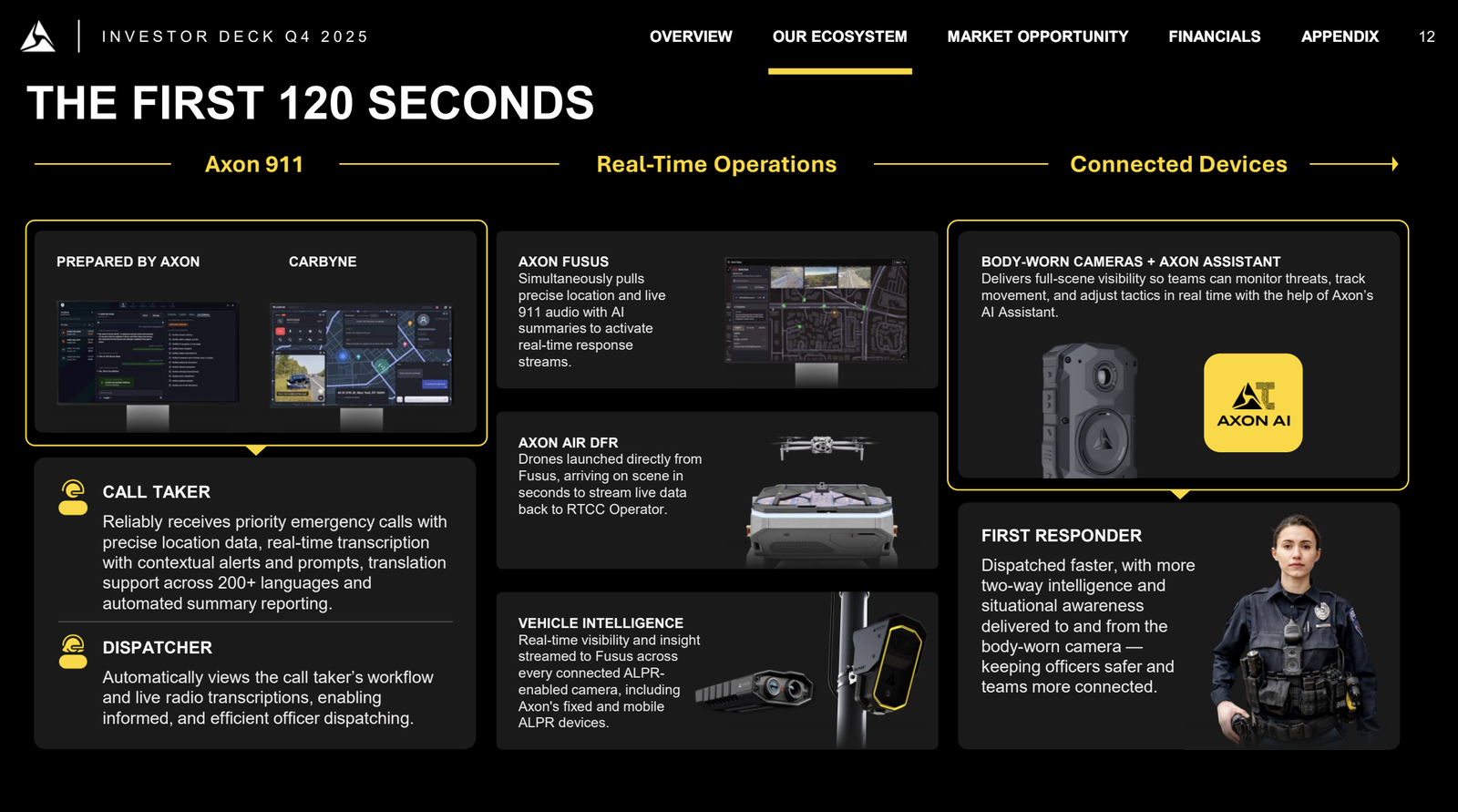 28 % EBITDA‑Marge impliziert rund 250 bp Expansion bis 2028. Klingt fast konservativ, wenn man bedenkt, wie hoch Software‑Margen sein können. Aber es ist plausibel, weil Axon parallel neue Kategorien aufbaut, inklusive 911. Die Übernahme von Prepared ist schon drin, Carbyne wurde kurz nach Q4 geschlossen, und die erste Integration Axon 911 plus Fusus ist bereits verkauft worden. Damit rückt Axon noch mehr an den Beginn von Notfällen und orchestriert die komplette Kette.