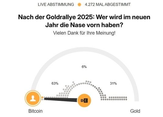 • Das Ergebnis fällt deutlich aus: 63 Prozent trauen BTC im neuen Jahr die bessere Performance zu, während 31 Prozent auf Gold setzen. Weitere 6 Prozent positionieren sich dazwischen und legen sich nicht klar fest.