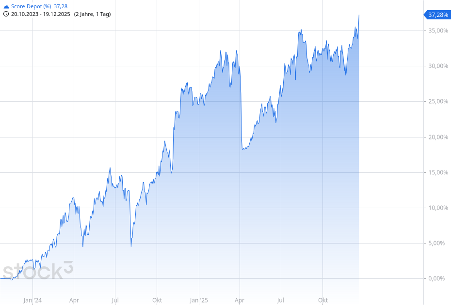 In der vergangenen Woche konnte das Depot zulegen und ein neues Rekordhoch erreichen. Seit Start im Oktober 2023 befindet sich das Score-Depot gut 37 % im Plus.