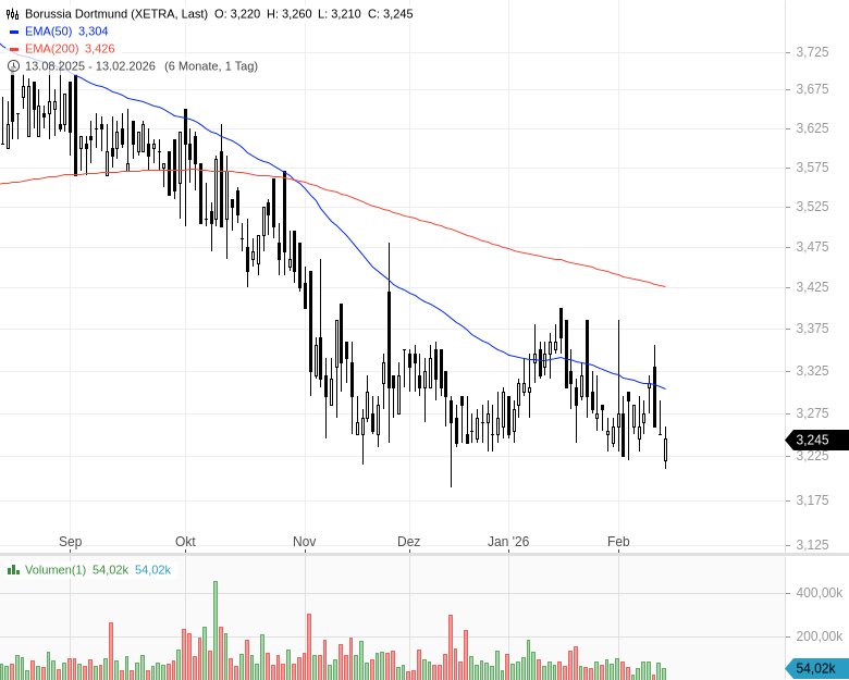 Für das laufende Geschäftsjahr 2025/2026 bestätigte Borussia Dortmund die bereits zum 30. Juni 2025 abgegebene Prognose. Demnach rechnet der Fußballclub weiter mit einem Umsatzrückgang auf 475 Mio. EUR, von 528,7 Mio. EUR im vorherigen Geschäftsjahr. Das EBITDA dürfte sich allerdings auf 105 bis 115 Mio. EUR verbessern, von 100,1 Mio. EUR im Geschäftsjahr 2024/2025. Für EBIT und Nettogewinn wird jeweils ein Betrag zwischen -5 Mio. EUR und +5 Mio. EUR in Aussicht gestellt, nach -1,4 Mio. EUR bzw. 7,6 Mio. EUR im vorangegangenen Geschäftsjahr. Der Free Cashflow dürfte von 17,8 Mio. EUR auf 7 Mio. EUR sinken.