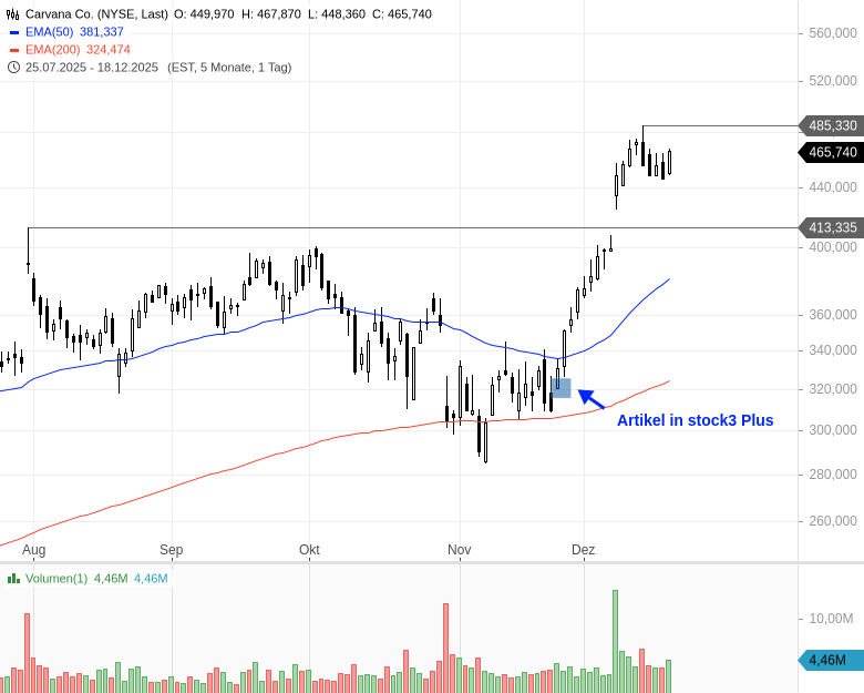 Der Hinweis auf die Carvana-Aktie Ende November war Gold wert. Auch dank S&P-500-Aufnahme sprang der Titel in einem Lauf um 50 % nach oben. Die Muster bleiben bullisch.