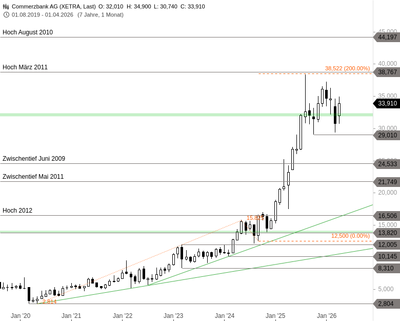 Am übergeordneten Kursziel bei 38,52 EUR und dem Hoch aus dem März 2011 bei 38,76 EUR wurde die extrem steile Aufwärtstrendphase im August letzten Jahres gestoppt, die die Aktie der Commerzbank zuvor seit dem Ausbruch über das Hoch aus dem Mai 2024 bei 15,82 EUR über 200 % nach Norden katapultiert hatte.