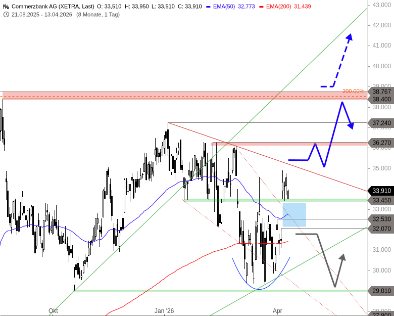 Seither läuft eine sich tendenziell dreiecksförmig zuspitzende Konsolidierung, die nach der Verteidigung der Unterstützung bei 29,01 EUR in den letzten Tagen in eine steile Kaufwelle überging. Insbesondere das Aufwärts-Gap vom 8. April, das den Titel wieder über den früheren Support bei 33,45 EUR und eine kurzfristige Abwärtstrendlinie angetrieben hatte, hat hier die Ambitionen der Käuferseite aufgezeigt.