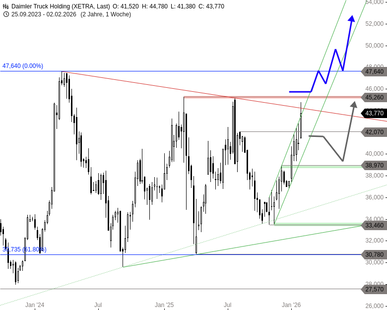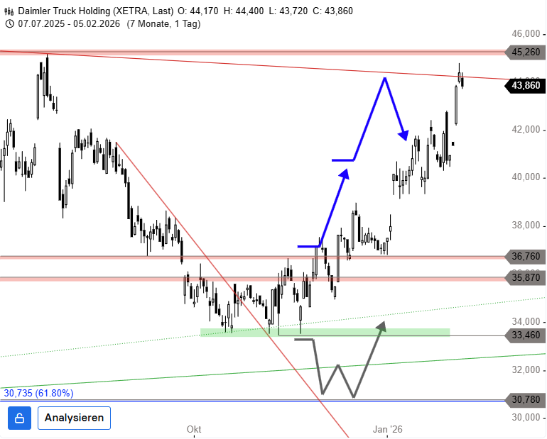 Charttechnisches Fazit: Die Daimler-Truck-Aktie könnte die aktuelle Aufwärtsdynamik für den unmittelbaren Sprung über die Abwärtstrendlinie und den Widerstand bei 45,26 EUR nutzen. Neben einem Aufwärtsimpuls an das Allzeithoch bei 47,64 EUR könnte es sogar zu einer Rallyausweitung bis 49 EUR und 53 EUR kommen.