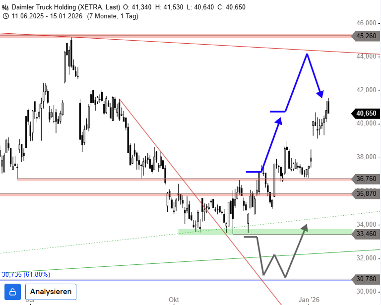 Übergeordnet befindet sich die Aktie des LKW-Herstellers nach dem Ende eines mittelfristigen Aufwärtstrends und einem Allzeithoch bei 47,64 EUR seit dem Frühjahr 2024 in einer großen Konsolidierung. Diese ist von extrem scharfen Richtungswechseln geprägt und spitzt sich übergeordnet dreiecksförmig zu.