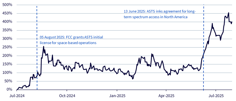 Quelle: WisdomTree, Bloomberg – Stand: 25. Juli 2025 FCC ist die Abkürzung für die US-amerikanische Federal Communications Commission ASTS steht für AST SpaceMobile. Die historische Wertentwicklung ist kein Indikator für die zukünftige Performance und alle Anlagen können an Wert verlieren.