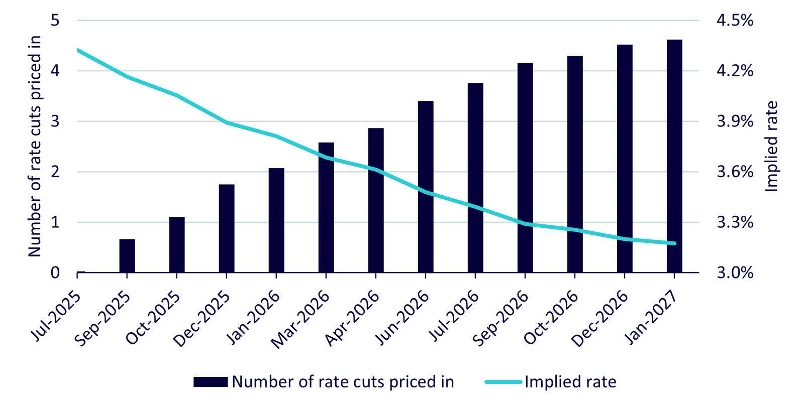 Abbildung 4: Marktabgeleitete Anzahl der US-Zinssenkungen und implizierter Leitzins der Fed