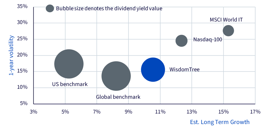 Dank seines technologieorientierten Portfolios weist der WTRE auch ein höheres zukunftsorientiertes Wachstum auf. Das geschätzte langfristige Gewinnwachstum liegt bei etwa 10,6 %2 und übertrifft damit sowohl die globalen als auch die US-amerikanischen Immobilien-Benchmarks. Darüber hinaus bietet der WTRE im Vergleich zu reinen Technologieindizes wie dem Nasdaq-100 oder dem MSCI World IT eine bessere Balance, da er deutlich höhere Dividendenrenditen (2,7 % gegenüber weniger als 0,7 % bei Technologieindizes)3 und eine deutlich geringere Ein-Jahres-Volatilität aufweist.