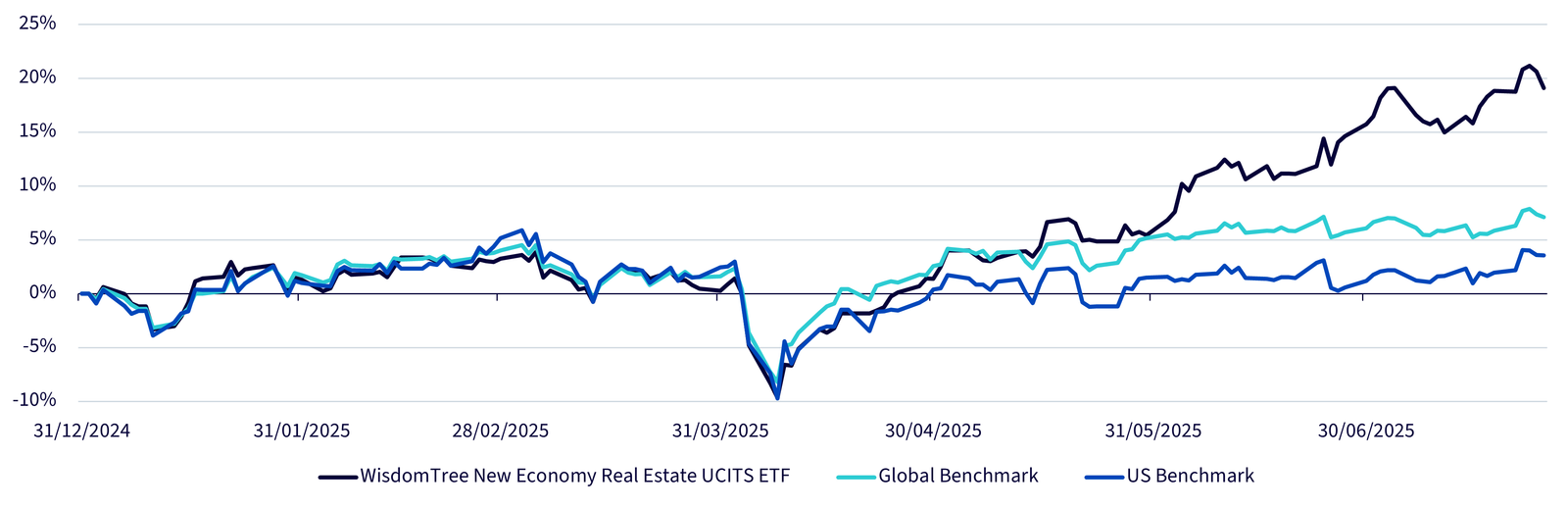 Quelle: WisdomTree, Bloomberg. Daten vom 31. Dezember 2024 bis zum 25. Juli 2025. Der globale Referenzindex ist der FTSE EPRA/Nareit Developed Index. Der US-Referenzindex ist der FTSE Nareit All Equity REITs Index. Die Leistung des Fonds basiert auf dem Nettoinventarwert des Fonds in USD. Sie können nicht direkt in einen Index investieren. Die historische Wertentwicklung ist kein Indikator für die zukünftige Performance und alle Anlagen können an Wert verlieren.
