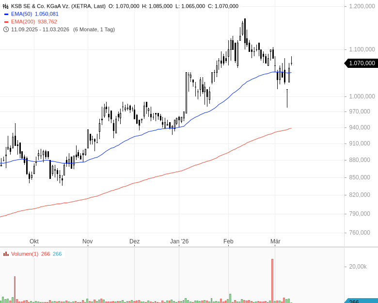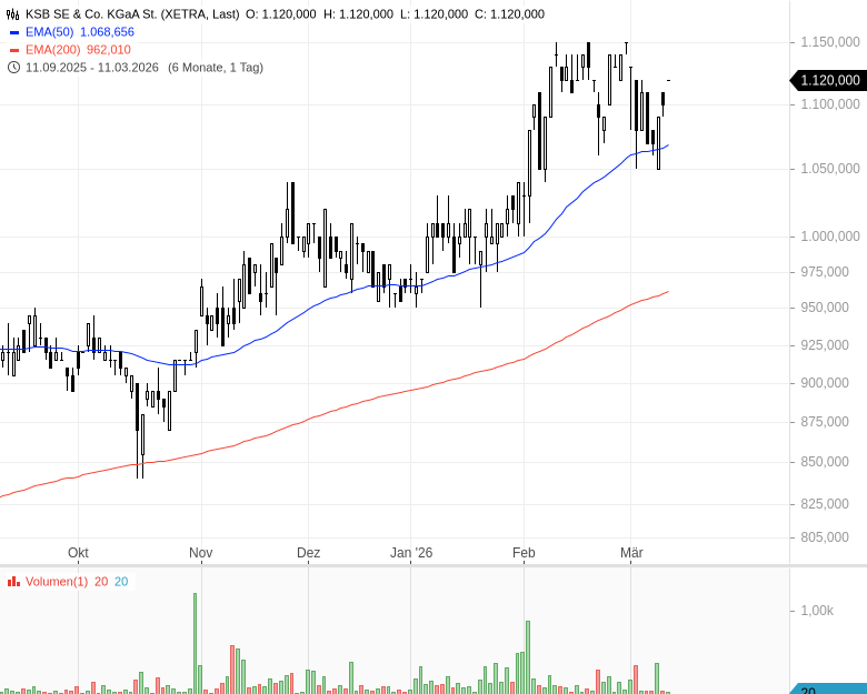 • KSB SE & Co. KGaA Vz. – WKN: 629203 – ISIN: DE0006292030 – Kurs: 1.075,000 € (XETRA)
