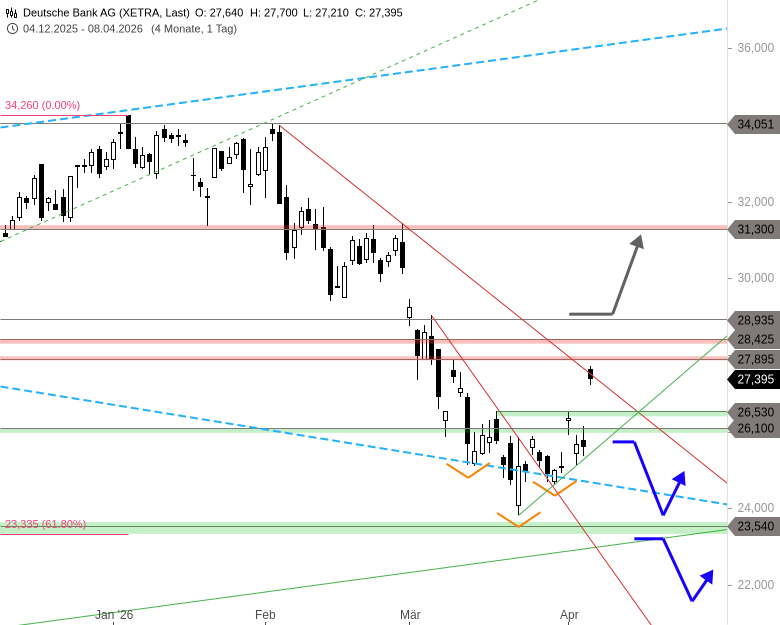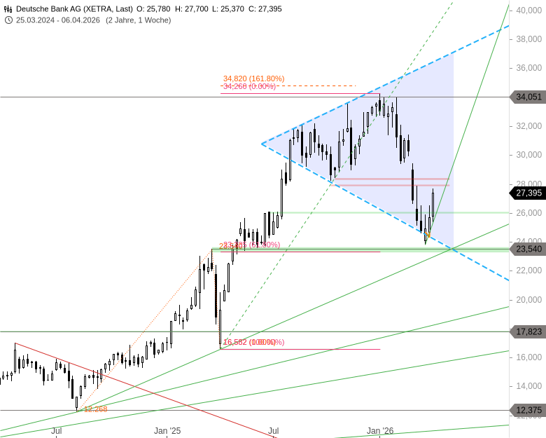 Von der Unterseite einer seit August letzten Jahres dominierenden, sich ausweitenden Dreiecksformation (siehe Wochenchart unten) und der knapp darunter liegenden Supportmarke bei 23,54 EUR war die Aktie der Deutschen Bank in den letzten Tagen bereits an, sowie kurzfristig über den Widerstand bei 26,10 EUR gestiegen. Die Chance auf eine Erholung an der Dreiecksunterseite wurde damit bereits genutzt.