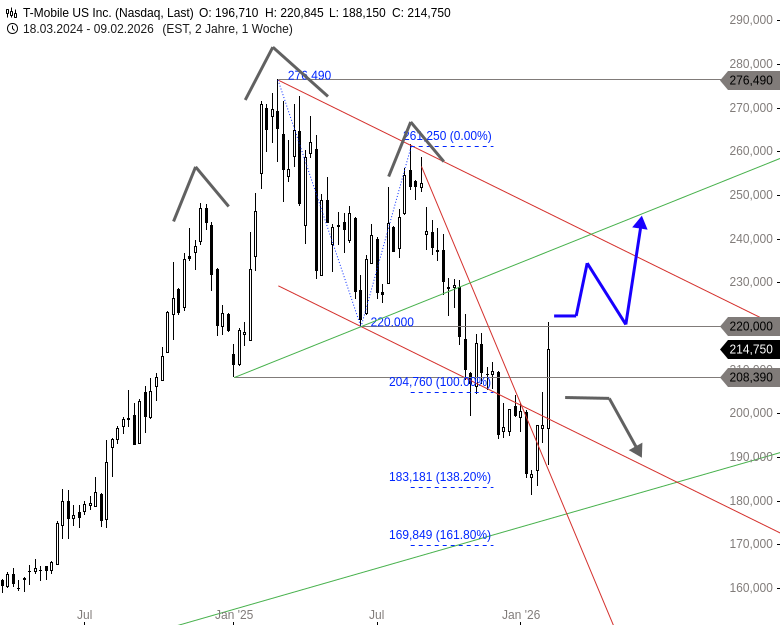 Entgegen meiner ursprünglichen Einschätzung aus dem Dezember letzten Jahres, benötigte die Aktie von T-Mobile US tatsächlich noch den Abverkauf in Richtung des Projektionsziels bei 184 USD, bevor eine deutliche Erholung starten konnte. Diese wurde am Mittwoch nach der Veröffentlichung der Quartalszahlen zunächst auf eine harte Probe gestellt: Intraday gab der Titel zuerst fast 6 % nach, doch bereits nach wenigen Handelsminuten wendete sich das Blatt: Der Markt entschied sich, die Zahlen von T-Mobile US doch positiv aufzufassen und unterstrich dies mit einer Intraday-Rally von rund 17 %. Das nächste Kaufsignal würde bei der Aktiejetzt mit einem Anstieg über 221 USD per Wochenschlusskurs aktiviert.