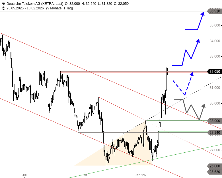 Die Rückkehr in den dominierenden Abwärtstrendkanal und die Verteidigung von dessen Unterseite bei 26 EUR lieferten Ende Januar die Voraussetzungen für eine hochdynamische Erholung, die die Aktie der Deutschen Telekom direkt über die zentrale Abwärtstrendlinie und den Widerstand bei 30,41 EUR angetrieben hat. Wie erwartet erreichte die Aktie in den letzten Tagen auch die Hochs von Juli und August letzten Jahres bei rund 32 EUR.