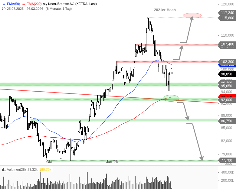 Auf der Unterseite stützt jetzt der Bereich bei rund 96 EUR. Unterhalb von 95 EUR könnte es zu einem weiteren Test der zentralen Unterstützung bei 92 EUR kommen. Erst ein signifikantes Abrutschen unter 91 EUR würde größere Verkaufssignale liefern. Dann wäre die Aktie anfällig für weiter fallende Kurse in Richtung 87 EUR oder noch deutlich tiefer.