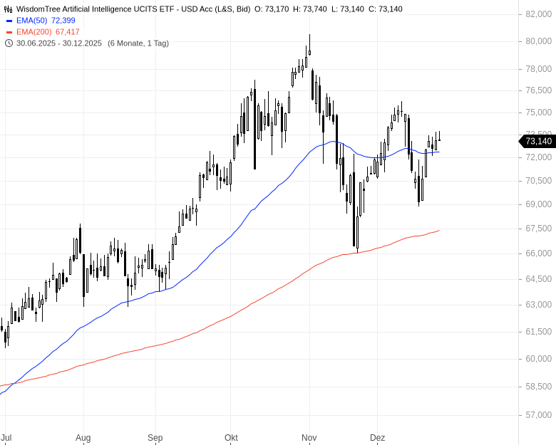 - WisdomTree Artificial Intelligence UCITS ETF – USD Acc – WKN: A2N7KX – ISIN: IE00BDVPNG13 – Kurs: 73,140 € (L&S)