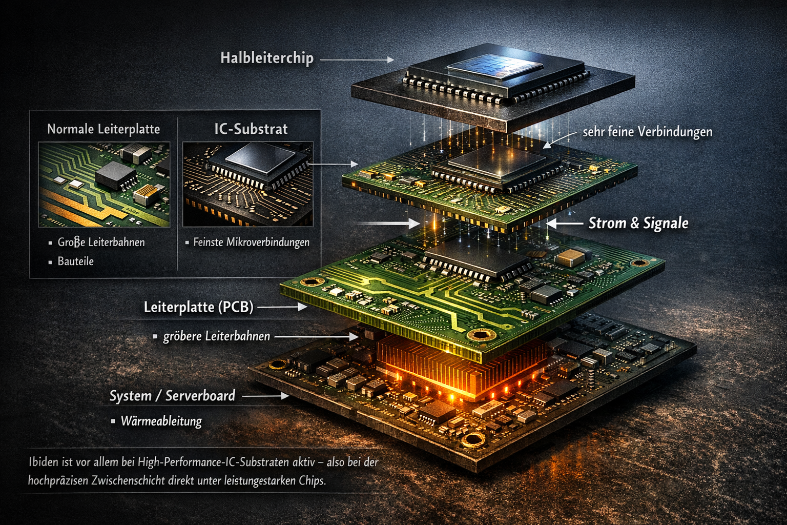 Besonders interessant ist das Unternehmen, weil es spezielle Zwischenschichten baut, sogenannte IC-Substrate, die direkt unter einem Chip sitzen und ihn mit der eigentlichen Leiterplatte verbinden. Eine Leiterplatte besteht im Kern aus einem isolierenden Material, meist glasfaserverstärktem Epoxidharz, auf das dünne Kupferschichten aufgebracht werden. Durch Ätzen entstehen Leiterbahnen, die die Bauteile miteinander verbinden.