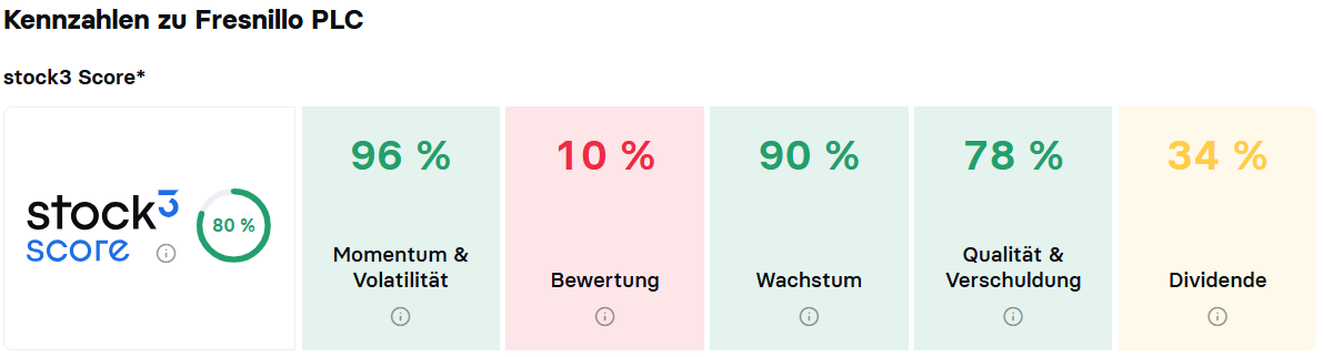 Aktuell schneidet Fresnillo im stock3 Score weiter gut ab. Dazu tragen vor allem ein hohes Umsatz- und Gewinnwachstum, ein hohes Kursmomentum und eine hohe Ergebnis- und Bilanzqualität bei.
