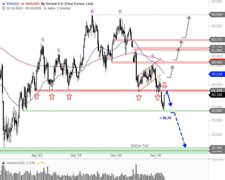 Der Durchbruch unter die 31,20-EUR-Marke, an der alle Zwischentiefs seit 2023 markiert wurden, könnte sich als charttechnischer Genickbruch bei der Renault-Aktie erweisen. Zunächst wird der Kurseinbruch aber am Support bei 26,89 EUR aufgefangen.