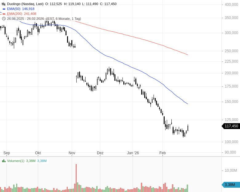 Fazit: Duolingo fordert Investoren auf, ein Übergangsjahr zu akzeptieren. Nach eigenen Angaben hat das Unternehmen 2025 mehr als 1 Mrd. USD an Bookings erzielt und über 300 Mio. USD bereinigtes EBITDA erwirtschaftet. Die operative Basis ist damit solide. Doch 2026 wird bewusst als Investitionsjahr angelegt, mit geringerer Dynamik bei den Bookings und einer bereinigten EBITDA-Marge von rund 25 %. Ob KI Duolingo mittelfristig komplett disruptieren kann, bleibt die größte noch offene Frage. Ich würde erst einmal abwarten bis sich der Staub etwas verzieht und das Unternehmen wieder liefern kann, ehe ich einen Trade wage. Die Bewertung mit einem 10er-KGV auf Non-GAAP-Basis für kommendes Jahr schaut zumindest recht günstig aus. Auf GAAP-Basis liegt das KGV allerdings doppelt so hoch. Die Gewinnschätzungen werden aber jetzt erst einmal noch nach unten genommen werden.