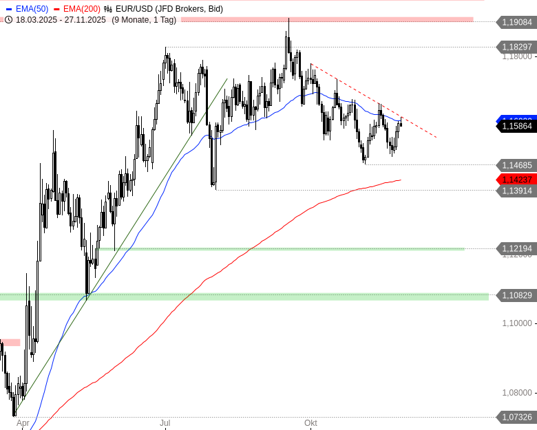Der aktuelle Kurs von 1,15860 $ liegt also genau im Bereich der möglichen Konsolidierung. Spannende Zeiten für alle Trader!