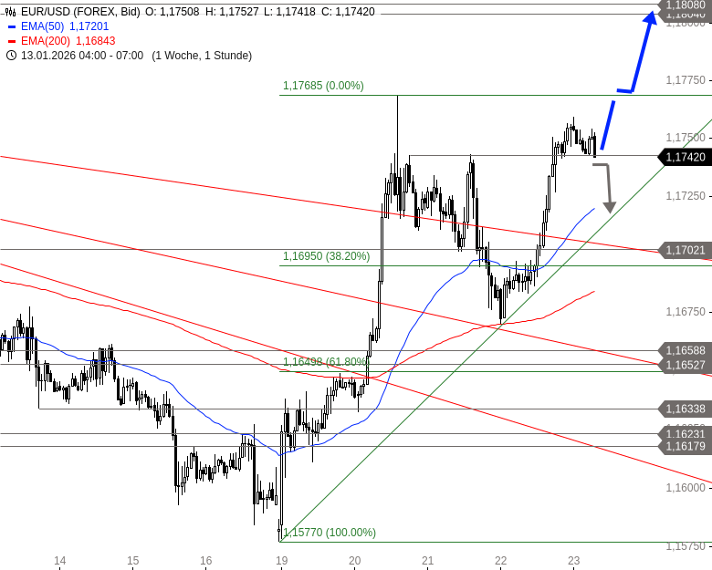 Die genannten Unterstützungen bei 1,1743, 1,1720 und 1,1709 USD sind entscheidend. Ein Bruch unter 1,1743 USD würde die kurzfristige Aufwärtsbewegung gefährden.