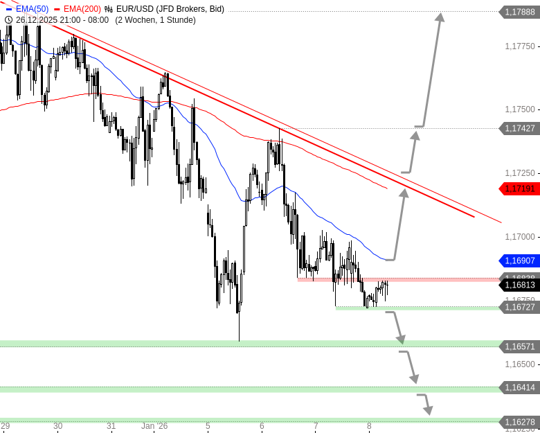 Fällt EUR/USD hingegen auch unter 1,1672 USD zurück, wären weitere Abgaben bis 1,1657 – 1,1659 und darunter 1,1641 oder 1,1628 USD denkbar.