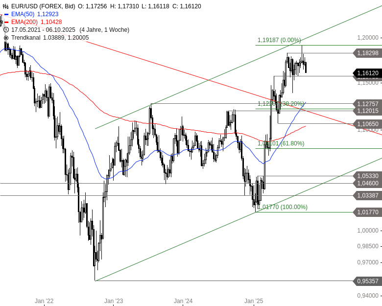 EUR/USD befindet sich seit dem Jahreshoch bei 1,1919 USD vom 17. September 2025 in einer Abwärtsbewegung. Dabei das Währungspaar unter den Aufwärtstrend ab 01. August 2025 und auf ein Tief bei 1,1645 USD. Nach einem Pullback an den gebrochenen Aufwärtstrend gab es nach einem ersten erfolgreichen Test der Unterstützung bei 1,1645 USD kurzzeitig die Chancen auf einen Doppelboden. Aber heute Nacht fiel das Währungspaar unter diese Unterstützung ab und gibt seitdem weiter nach.