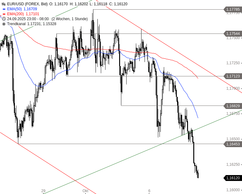 Der Bruch des Aufwärtstrends seit Februar 2025 ist besorgniserregend, besonders da er gleichzeitig mit dem Unterschreiten der 1,1645 USD-Unterstützung geschah. Könnte dies ein Zeichen für eine stärkere Abwärtsbewegung sein, als bisher angenommen?