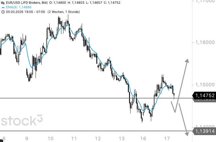 Im vorbörslichen Handel scheinen die Verkäufer im EUR/USD zurück zu sein. Im Laufe des Tages könnte so der Supportbereich ab 1,14685 – 1,14500 USD getestet werden. Von hier aus ist ein neuer Rallyversuch nicht ungewöhnlich. Sollte dieser gelingen, könnten es zu einem Überschreiten des gestrigen Tageshochs kommen, was den kleinen, sehr kurzfristigen Boden im EUR/USD bestätigen würde. Weitere Gewinne in Richtung 1,15695 wären möglich. Laufen die Stabilisierungsbemühungen hingegen ins Leere, müsste mit einem Test der bisherigen Tiefs und sogar ein Rutsch unter 1,13914 USD gerechnet werden – zumindest temporär.
