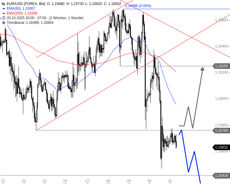 Mich wundert, dass der Abverkauf erst knapp über dem Tief vom 09. Oktober bei 1,1542 USD gestoppt wurde. Deutet das auf eine gewisse Stärke der Käufer in diesem Bereich hin, oder ist das nur ein vorübergehendes Phänomen?