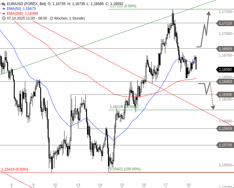 Die Erwähnung des EMA200 (Stundenbasis) bei 1,1649 USD als Unterstützung ist hilfreich. Ich werde diesen Wert genau beobachten, um zu sehen, ob er hält und eine weitere Abwärtsbewegung verhindert.