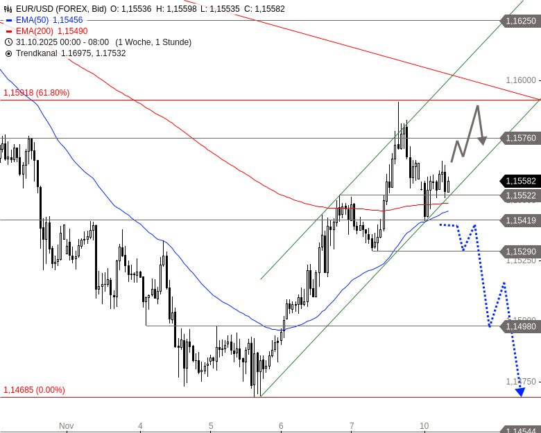 Ich beobachte den EUR/USD schon länger, und ein Rückfall unter 1,1542 USD würde meine pessimistische Einschätzung bestätigen. Der Abwärtstrend ist hartnäckig.