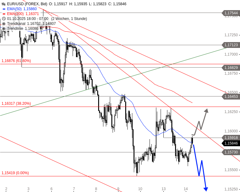 Ich bin etwas skeptisch, ob der EUR/USD wirklich direkt bis 1,1542 USD fallen wird. Die Erholung seit gestern Nacht zeigt zumindest etwas Kaufinteresse, auch wenn sie am Widerstand bei 1,1592 USD abprallte.