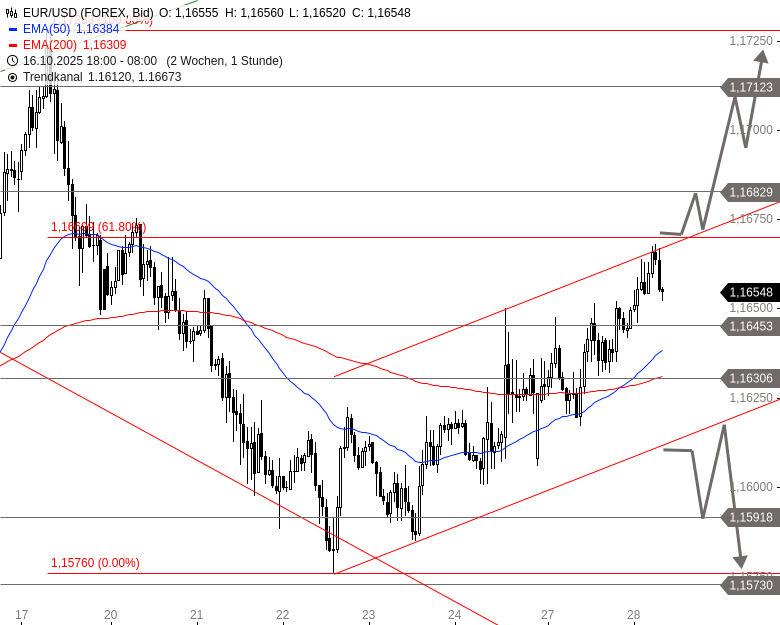 EUR/USD fiel am 22. Oktober 2025 auf ein Tief bei 1,1576 USD zurück. Danach drehte das Währungspaar wieder nach oben. Es befindet sich seitdem in einem Trendkanal und nähert sich heute Nacht dem log. 61,8%-Retracement der Abwärtsbewegung seit dem Hoch vom 17. Oktober an. Dieses Retracement liegt bei 1,1670 USD.