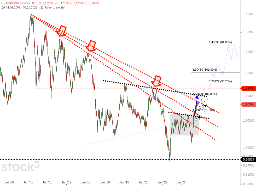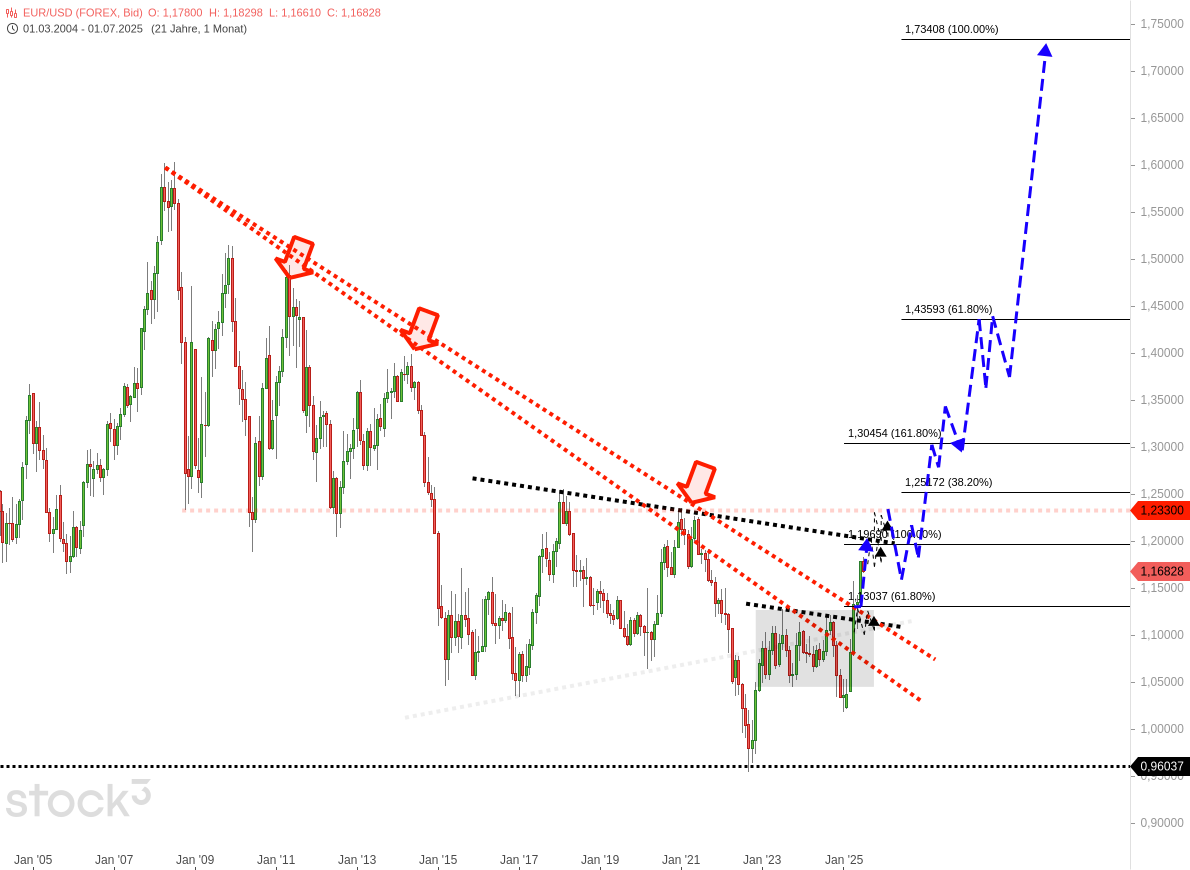 Euro vs US-Dollar – Langfristige Prognoseskizze als Grafiksnapshot – Chartanalyse & Trading – 1 Kerze = 1 Monat