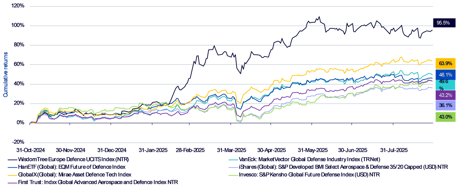 Quelle: WisdomTree, Bloomberg, vom Live-Berechnungstag des WisdomTree Europe Defence UCITS Index, dem 31. Oktober 2024, bis zum 29. August 2025. Die Berechnungen des WisdomTree Europe Defence UCITS Index (WTEUDEFN) verstehen sich in EUR. Die historischen Renditen der anderen Indizes sind ebenfalls in EUR berechnet. Es ist nicht möglich, direkt in einen Index zu investieren. Die historische Wertentwicklung ist kein Hinweis auf die künftige Wertentwicklung, und Anlagen können im Wert sinken.
