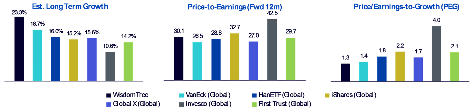 Quelle: WisdomTree, FactSet, Bloomberg, Stand: 29. August 2025.5 Die Bestände der Vergleichswerte wurden von Bloomberg bezogen. Die Fundamentaldaten stammen von FactSet. Die KGWV basieren auf dem zukünftigen KGV und dem geschätzten langfristigen Wachstum. Es ist nicht möglich, direkt in einen Index zu investieren. Die historische Wertentwicklung ist kein Hinweis auf die künftige Wertentwicklung, und Anlagen können im Wert sinken.