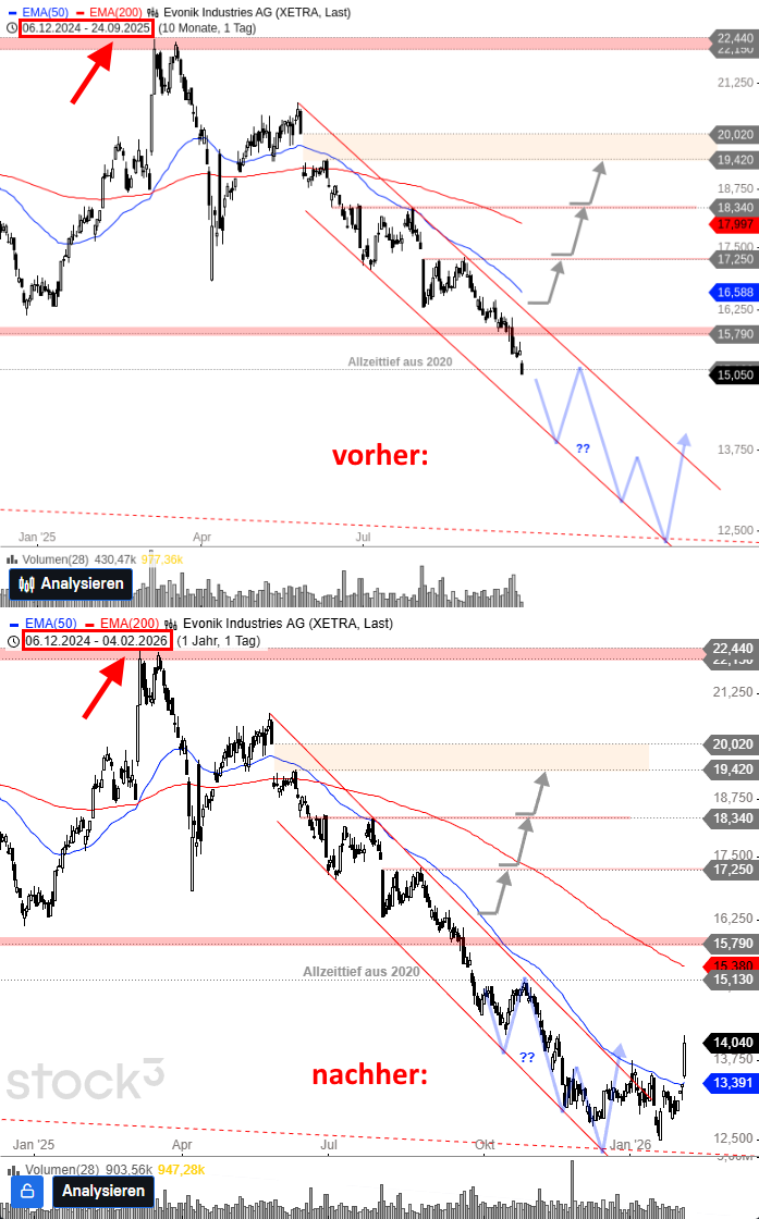Fazit: Zum ersten Mal seit Mai 2025 klettert die Evonik-Aktie wieder signifikant über den EMA50, zudem wird mit dem Anstieg über die Zwischenhochs seit Ende November ein höheres Hoch erreicht und ein Doppelboden vollendet. Es ist die beste Vorlage für die Bullen seit langer Zeit, eine Erholung könnte eingeleitet werden. Als einer der großen Underperformer am deutschen Markt sollte die Aktie aktuell aber als hochspekulativ eingestuft werden. Erneute Einbrüche auf neue Tiefs sollten hier nicht verwundern.