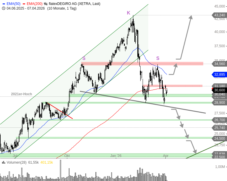 In einem bullischen Szenario startet vom aktuellen Preisniveau aus eine neue Aufwärtswelle. Eine Rückkehr über den EMA50 würde erste, positive Signale senden. Ein nachhaltiger Anstieg über 35 EUR würde schließlich ein größeres Kaufsignal mit Ziel am Jahreshoch bei 43,24 EUR liefern.