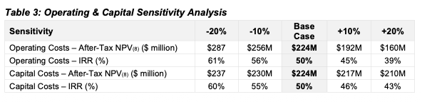 Zusätzlich veranschlage das Unternehmen 26 Mio. US-Dollar an Sustaining Capital Costs für Investitionen während des laufenden Betriebs sowie 4 Mio. US-Dollar für Rekultivierung und Schließung.