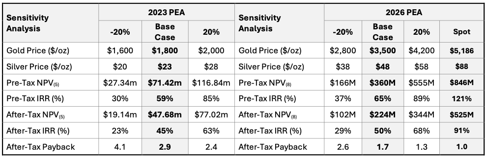 Bei aktuellen Spot-Preisen von 5.186 US-Dollar je Unze Gold und 88 US-Dollar je Unze Silber würde der Nachsteuer-NPV rechnerisch auf 525 Mio. US-Dollar steigen, während die IRR auf 91% klettern würde, erklärte das Unternehmen. Vor Steuern weise die Studie einen NPV8 von 360 Mio. US-Dollar und eine IRR von 65% aus.