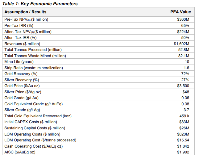 Im Basisszenario kalkuliere die PEA mit einem Goldpreis von 3.500 US-Dollar je Unze und einem Silberpreis von 48 US-Dollar je Unze. Daraus ergebe sich nach Angaben des Managements ein Kapitalwert (NPV8) bei 8% Abzinsung nach Steuern von 224 Mio. US-Dollar. Die Internal Rate of Return (IRR) liege bei 50%. Die Amortisationszeit betrage 1,7 Jahre.