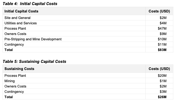 Das Investitionsvolumen umfasse den Bau der Aufbereitungsanlage, die Errichtung der Laugungsflächen, Infrastrukturmaßnahmen und Standortvorbereitung sowie indirekte Kosten für Planung, Beschaffung und Bauüberwachung EPCM Engineering, Procurement and Construction Management. Hinzu kämen 19 Mio. US-Dollar für eine Brech- und Förderanlage sowie 9 Mio. US-Dollar für das Abtragen von nicht mineralisiertem Deckgestein vor Produktionsbeginn.