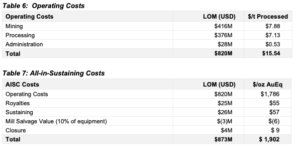 Die gesamten Betriebskosten über die Lebensdauer der Mine (Life of Mine/LOM) würden mit 820 Mio. US-Dollar angesetzt. Die All-in Sustaining Costs AISC lägen laut Unternehmen bei 1.902 US-Dollar pro Unze Goldäquivalent. Die operativen Cash-Kosten würden mit 1.842 US-Dollar je Unze Goldäquivalent angegeben.