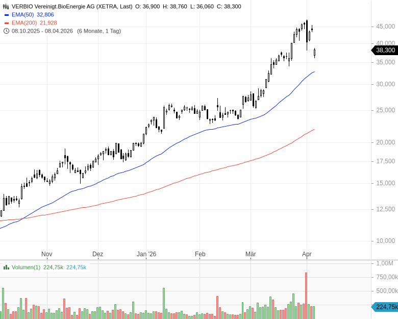 • VERBIO Vereinigt.BioEnergie AG – WKN: A0JL9W – ISIN: DE000A0JL9W6 – Kurs: 38,300 € (XETRA)
