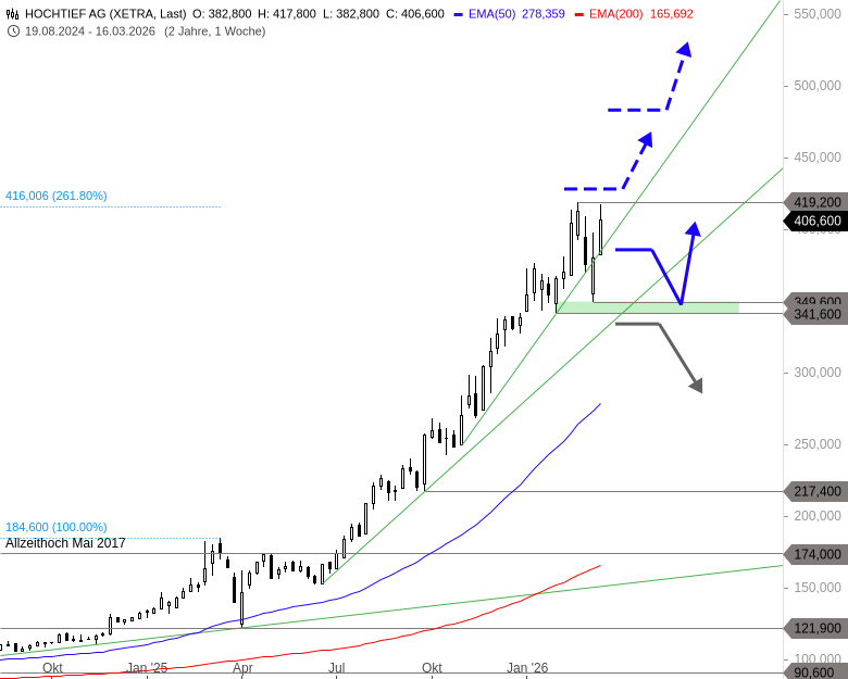 Scheitern die Käufer dagegen weiterhin an der 419,20 EUR-Marke, steht unterhalb von 385 EUR ein Rücksetzer bis 350 EUR an. Trotz des gewaltigen Höhenflugs der Aktie wären erst Abgaben unter 341,60 EUR bärisch zu werten.